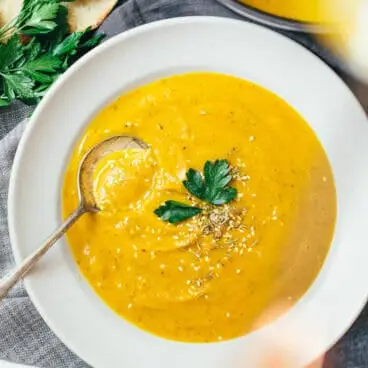 Esta sopa vegana de abóbora com tempero za'atar é uma versão do clássico do Oriente Médio; esta sopa aconchegante também leva batata doce e cenoura.
